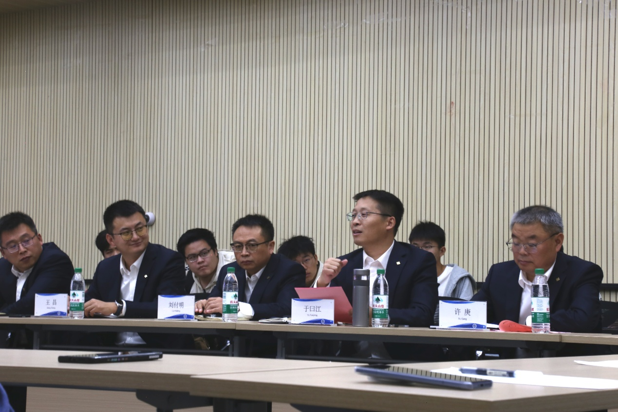 座谈会伊始,集团播放招录简章视频,徐海超向与会者介绍了各年级学生的生源构成及就业调查概况。随后,于曰江针对企业业态、招录素质标准、实习项目及可提供的科研项目平台等方面进行了简要概述。结合自身丰富的职场经历,于曰江不仅分享了宝贵的就业经验,还针对同学们在就业方面存在的疑虑进行了详尽解答,并热情邀请同学们积极提问。
