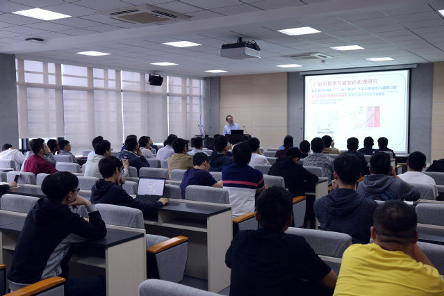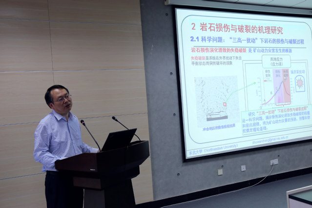报告会上朱万成教授以“深部三高一扰动”下岩石损伤与破裂过程的科学问题为主线进行了阐述,然后针对这一科学问题介绍了东北大学的研究团队在致灾环境、致灾机理和致灾过程方面研究的三项科研成果:(1)岩石类介质参数及损伤的数值表征方法(岩体表征),通过建立简单的应力-应变本构关系,从细观角度引入weibull分布来真实模拟岩石的不均匀性,基于Matlab和Comsol进行了混合编程,可表征岩石特征,(2)热流固耦合作用下岩体损伤演化规律(“三高”环境),揭示了岩体损伤对于采动诱发突水的控制机理,输出了基于损伤演化的突水判据,证实了温度对煤层渗透性的重要影响,阐明了地温场对煤层瓦斯运移的影响机理;(3)采动围岩损伤与破裂机理及致灾过程(开采扰动)。这些研究为揭示致灾机理,剖析致灾过程,为灾害预警及防控提供技术支撑。构建了多应变率条件下岩石损伤演化直至破裂全过程力学模型,发明了一套中应变率动力扰动试验装置,揭示了动态扰动触发深部巷道岩爆机理。在座的师生与朱万成教授进行了深入的交流讨论,为大家开展深部地下工程的研究提供了新的思路。