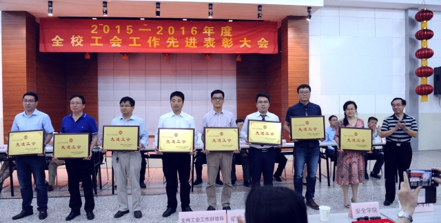 2017年5月22日下午3时整,中国矿业大学2015-2016年度工会工作先进表彰大会在文昌校区教工之家举行。校党委副书记蔡世华、校党委常委、组织部长王增国、工会主席李来成、学校各职能部门领导以及各基层单位分管工会工作的领导、二级工会主席、工会委员等出席了本次表彰大会。会议由工会主席李来成主持。学院工会积极组织工会委员参加了本次大会。