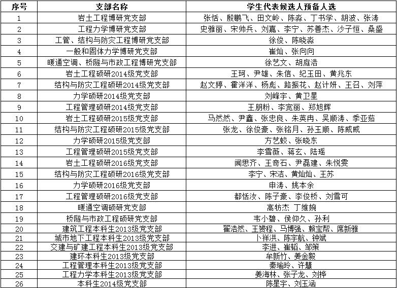 经学院党委研究决定,学生党员以党支部为单位选举代表参加学院党委委员选举大会。学生党员代表的名额按各支部正式党员总数的20%左右确定。经各学生党支部组织全体党员对代表人选进行酝酿提名,学院党委研究确定学生党员代表候选人预备人选共计92名。现将名单予以公示。